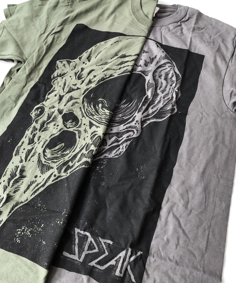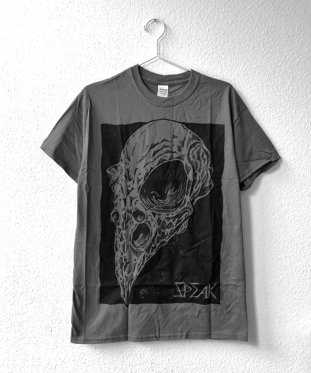 Screen printed T-shirts featuring the 'Crow Skull' illustration. Black screenprinted ink on charcoal or olive Gildan Heavy tees.