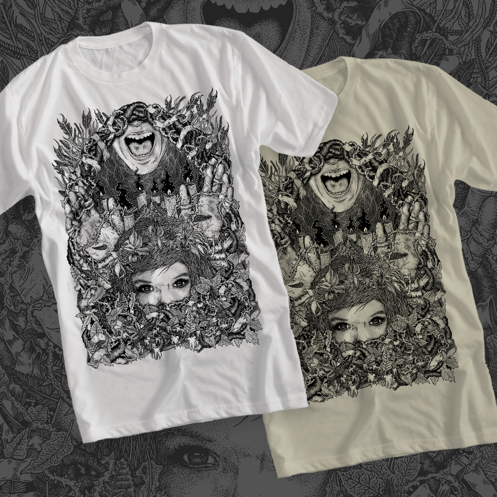 Screen printed T-shirt. Black ink on sand or white Gildan Heavy tees.